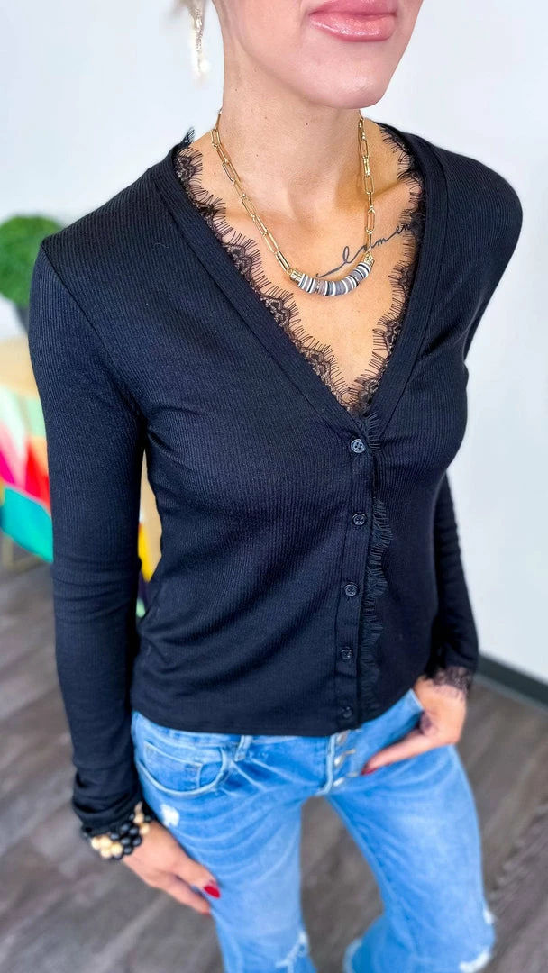 Darling, it’s time to add a little Charm to your days! This seasons must have! This black cardigan with lace detail is the perfect addition to your wardrobe. Dress it up or down, the options are endless. With a comfortable fit and true to size sizing, this cardigan is perfect for a busy woman on the go.