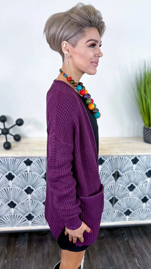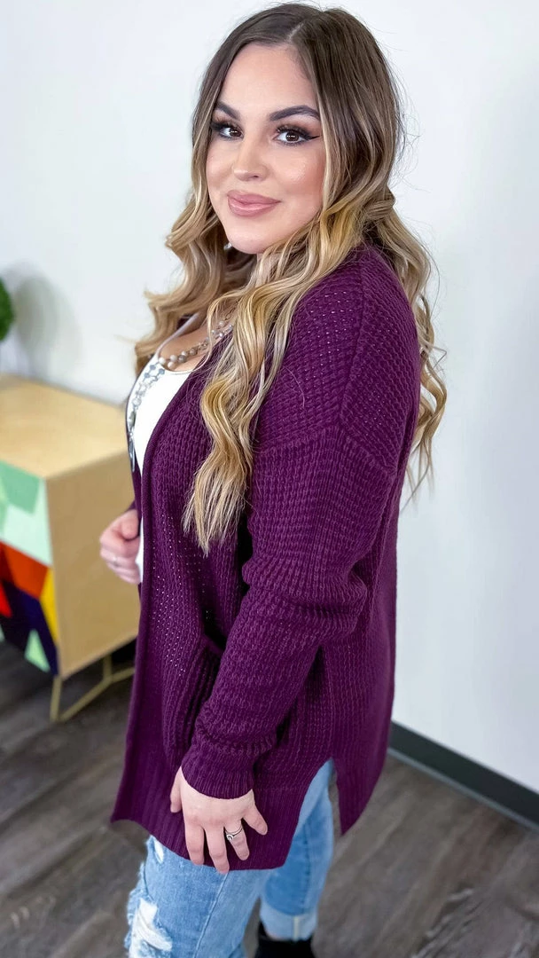 Never miss a beat in this Dark Plum Take Direction Cardigan. This waffle knit cardigan is perfect for throwing on over any outfit for an extra layer of warmth. The front pockets are perfect for carrying your phone, keys or any other small essentials. This cardigan will quickly become your go-to piece for any outfit.