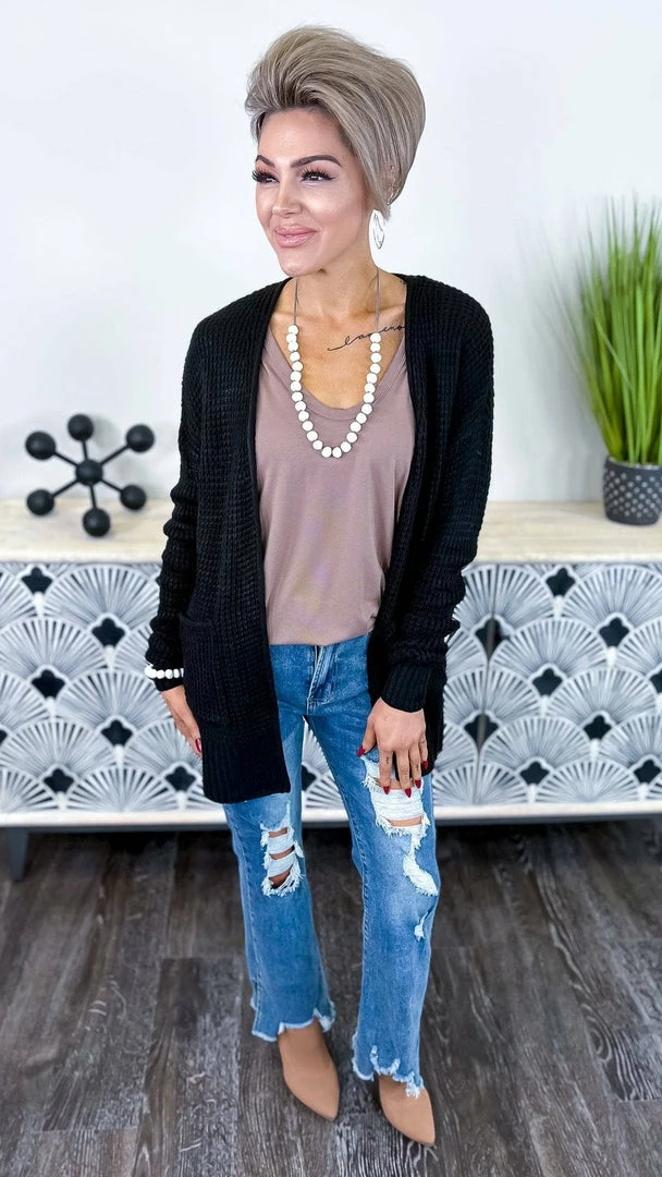 A cardigan with effortless style. Keep your look chic with this black cardigan. With an open front and long sleeves, it’s perfect for a relaxed vibe. The waffle knit texture gives it a touch of texture, making it perfect for any outfit. Whether you’re dressing up or dressing down, this cardigan is a must-have in your wardrobe.