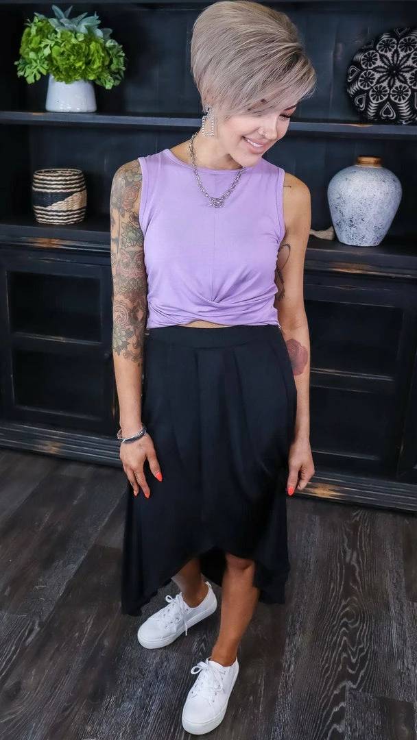 Get ready to turn some heads in thisΒ purpleΒ crop top. A summer must-have, this tank is sure to add some fun to your look. With a twisted front hemline, this top is sure to make a statement. Perfect for a day out in the sun, this tank will keep you cool and comfortable all day long.