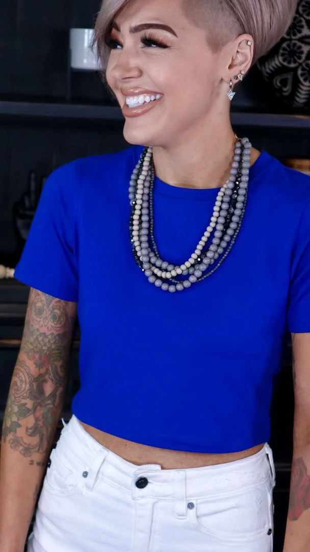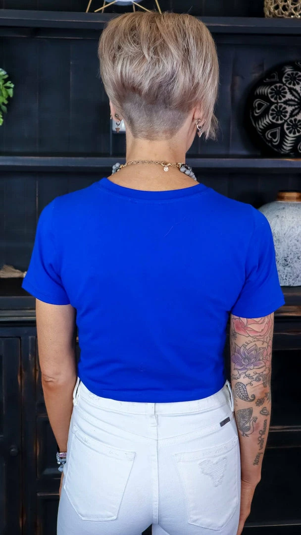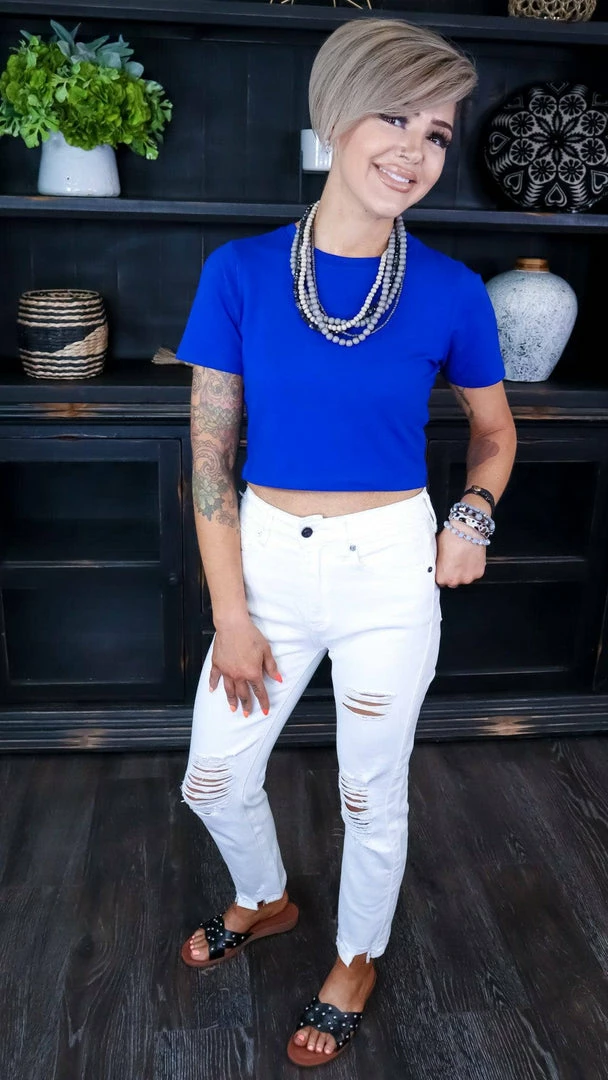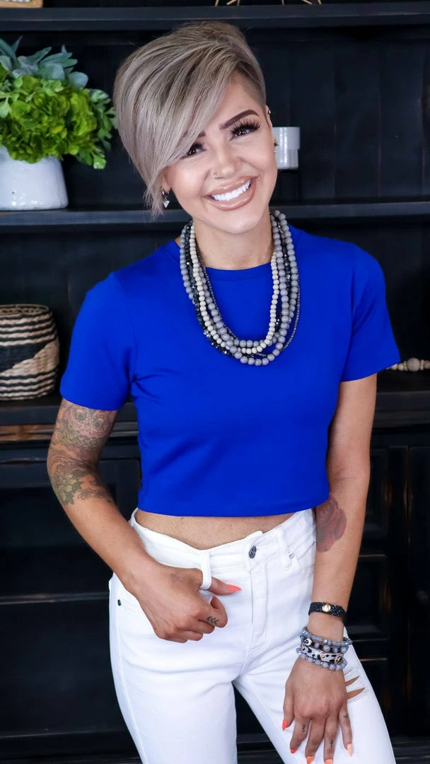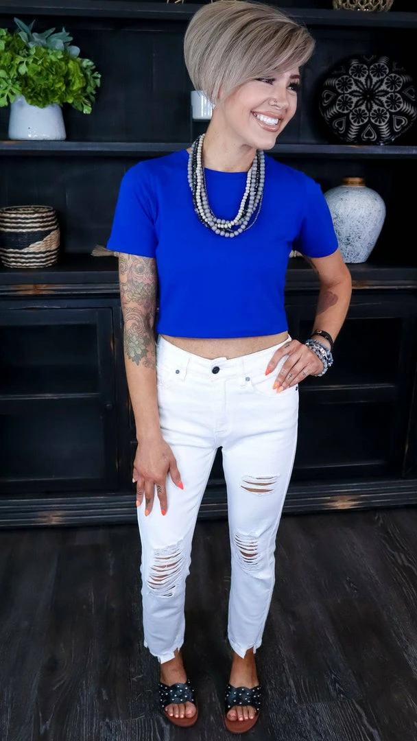 The perfect piece to top off your warm-weather look. A sleek and simple top, this solid piece is a go-to this year. With a cropped fit and short sleeves, it’s easy toΒ wear as is, or layer a denim jacket or cardigan over it. Style this top with your favorite pair of jeans or shorts for a look that’s both easy and effortless.