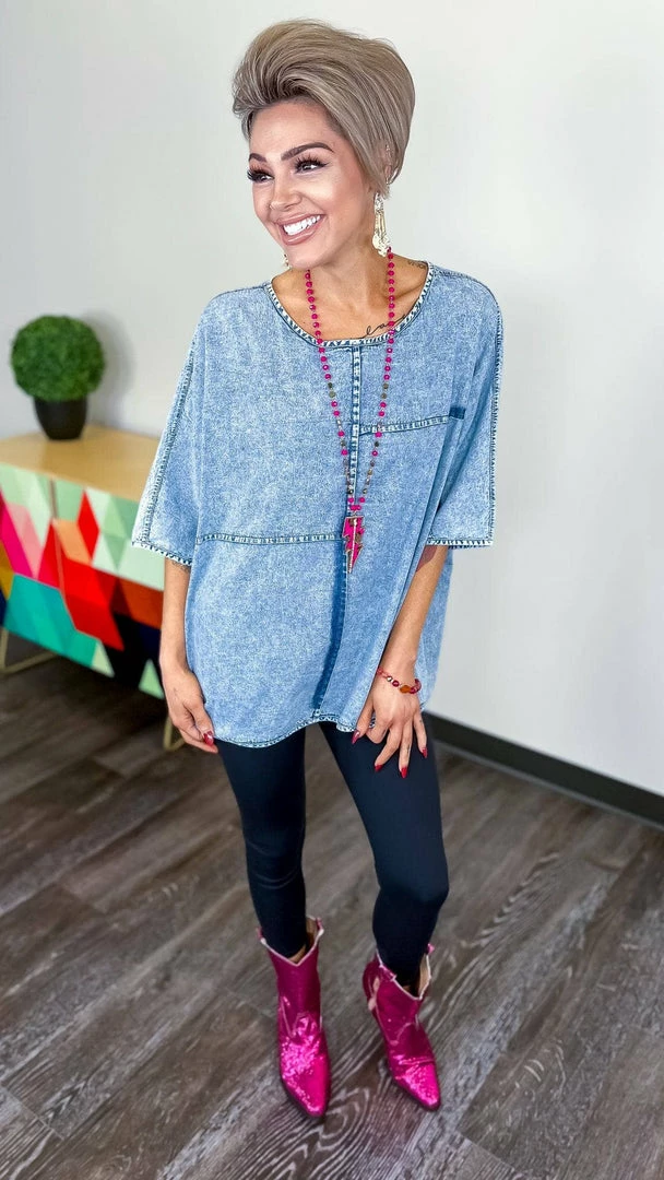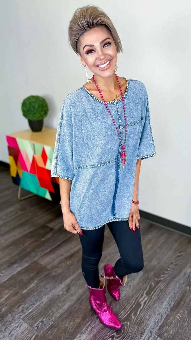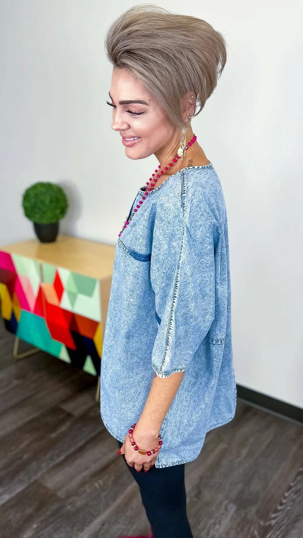 Here is a top for all your denim dreams!Β Style thisΒ super unique and cute top with white jeans or shorts and sandals!